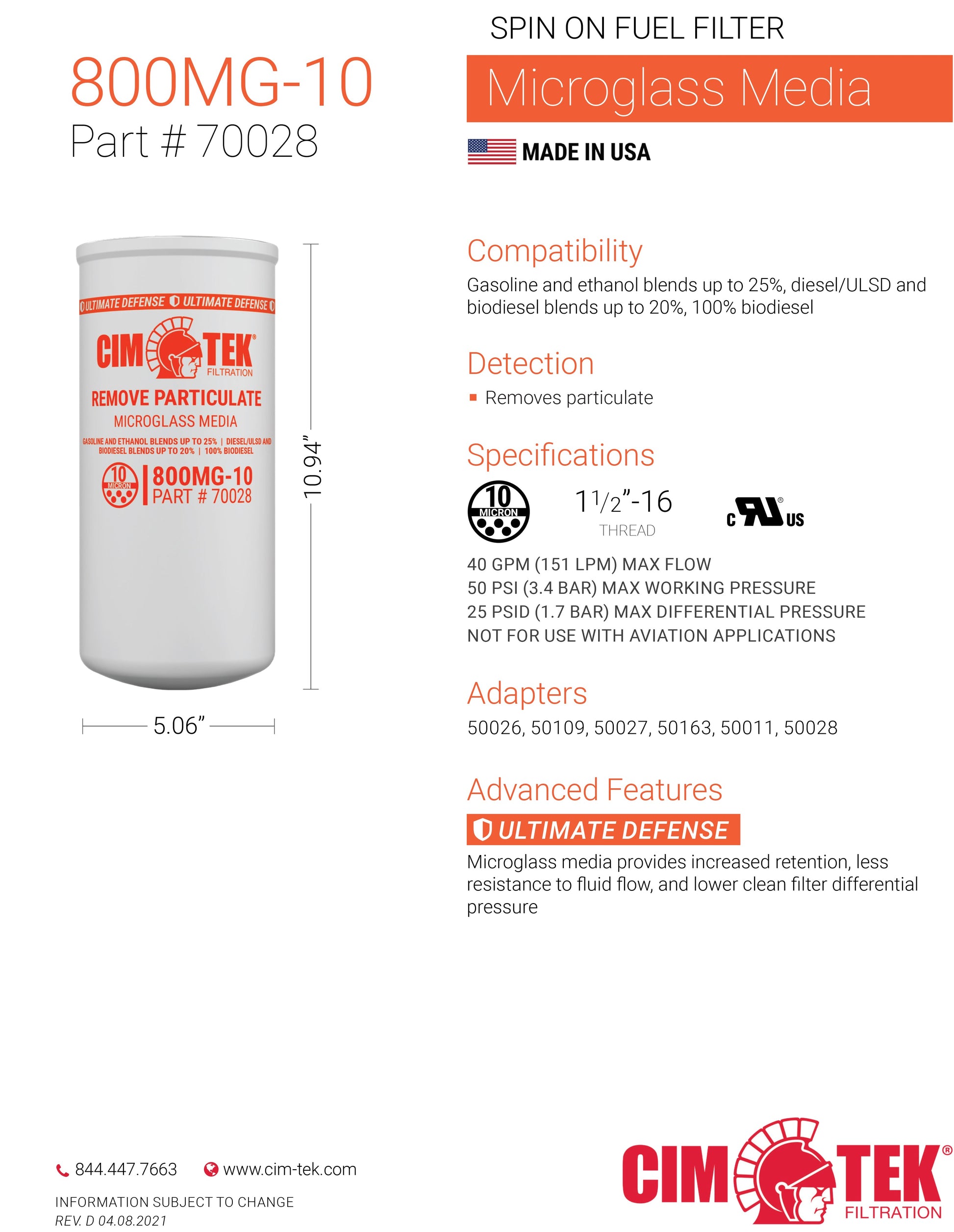 800 Series, High Volume 1-1/2"-16 Thread Spin On Filter 10 Micron, Microglass Element
