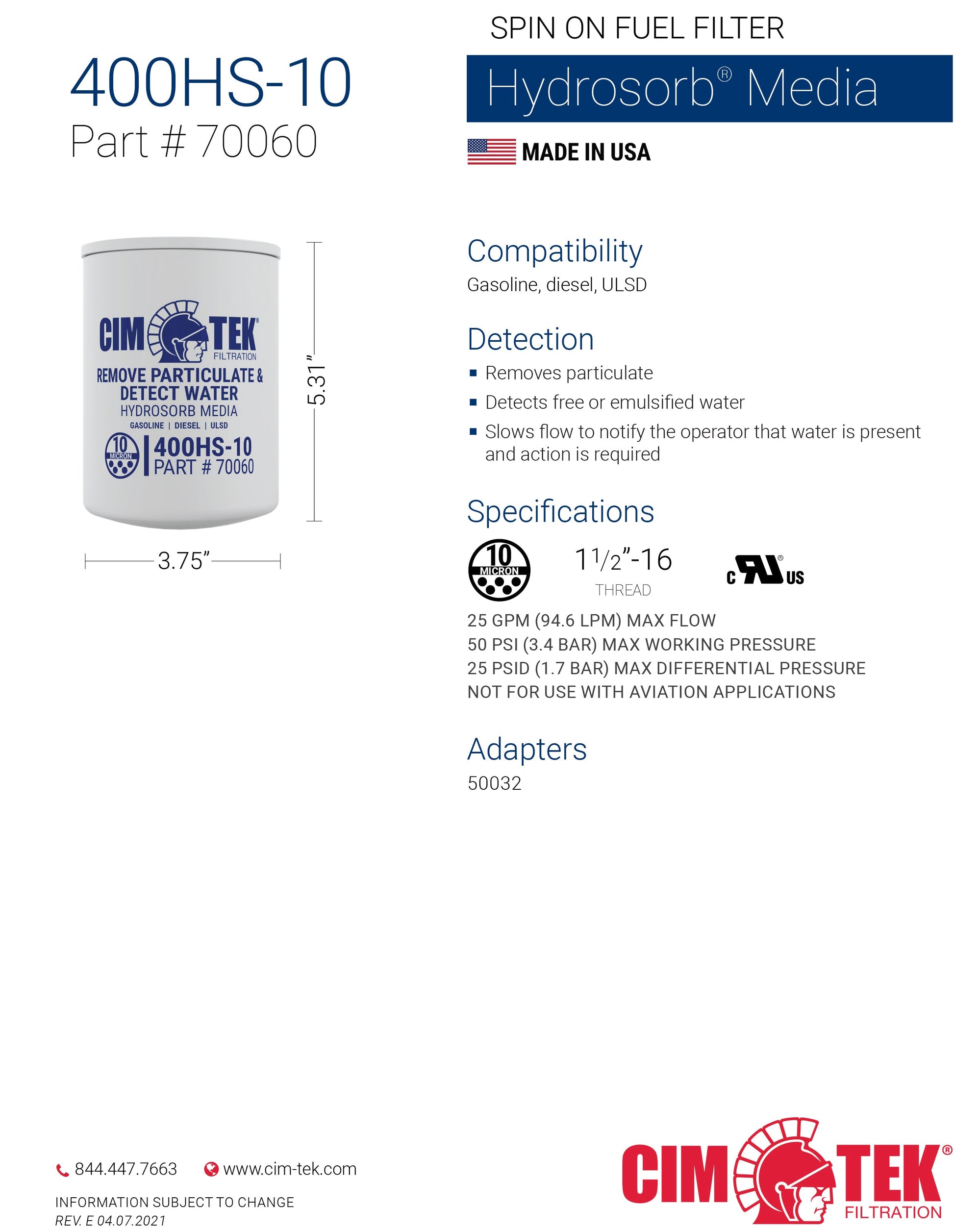 400 Series, Spin On Filter 10 Micron, Hydrosorb Element