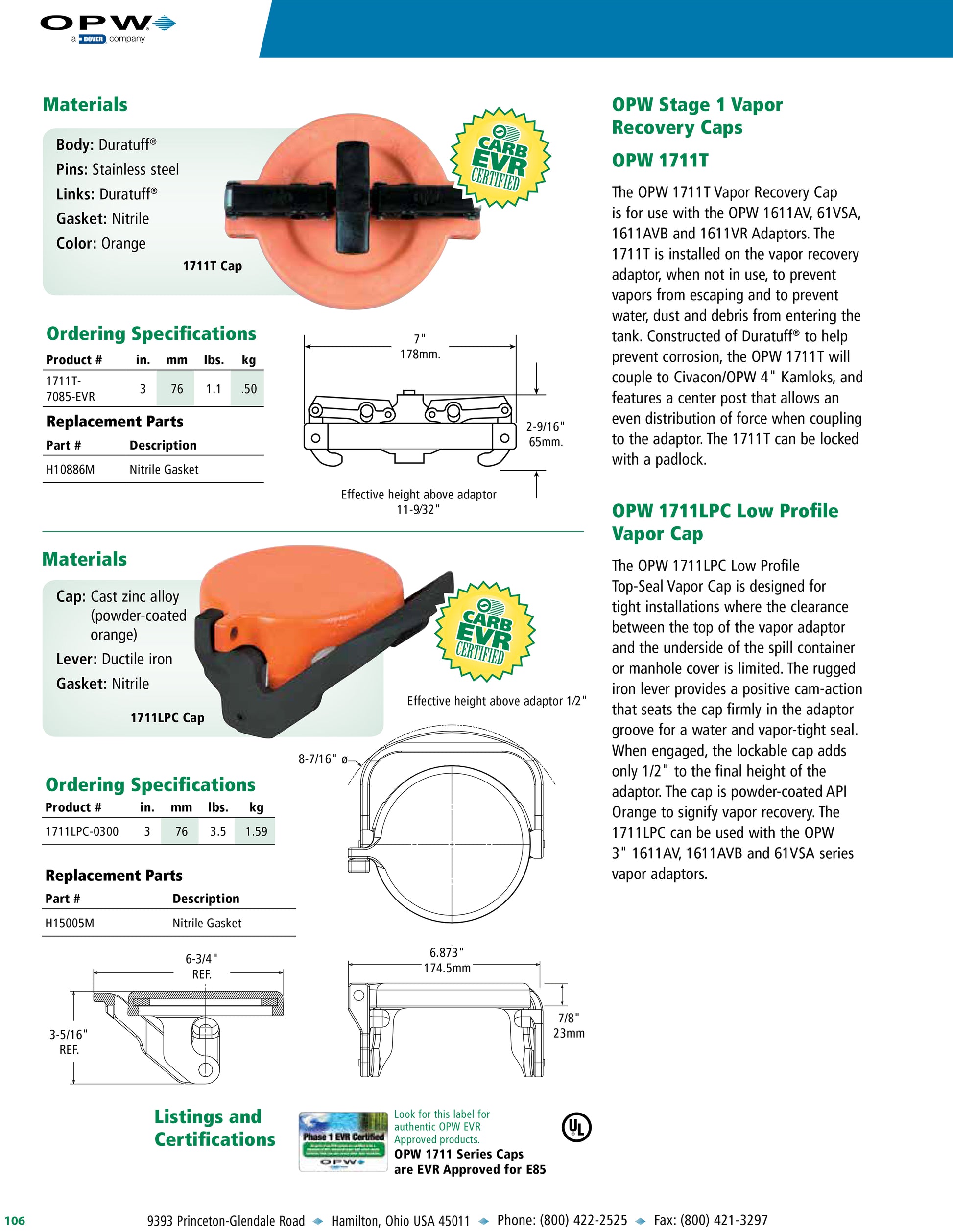 The OPW 1711T Vapor Recovery Cap is for use with the OPW 1611AV, 61VSA, 1611AVB and 1611VR Adaptors. The 1711T is installed on the vapor recovery adaptor, when not in use, to prevent vapors from escaping and to prevent water, dust and debris from entering the tank. Constructed of Duratuff® to help prevent corrosion, the OPW 1711T will couple to Civacon/OPW 4" Kamloks, and features a center post that allows an even distribution of force when coupling to the adaptor. The 1711T can be locked with a padlock.